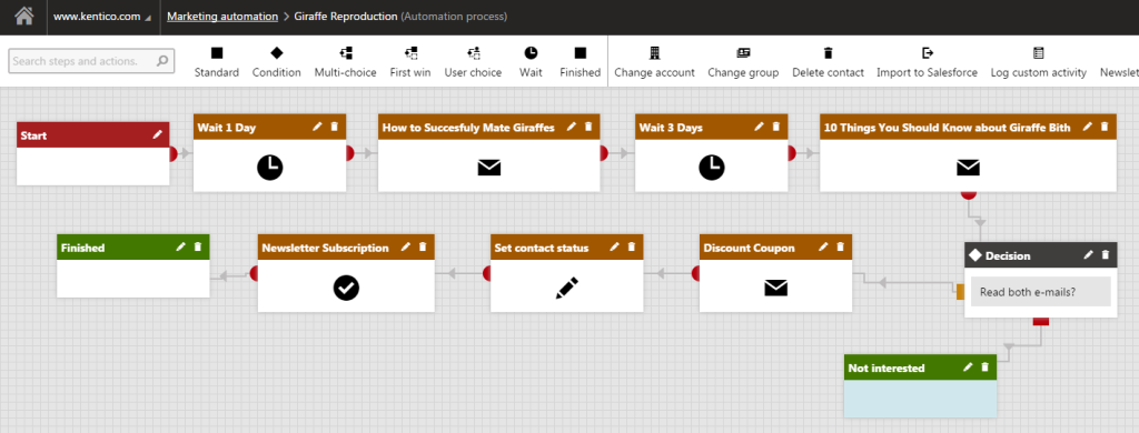 Le marketing automation de Kentico Xperience permet de créer des campagnes personnalisées qui s’adaptent en temps réel aux comportements et aux interactions des utilisateurs. En d’autres termes, il vous aide à déclencher des actions spécifiques, comme l’envoi d’un e-mail ou l’affichage d’une offre personnalisée, en fonction des actions effectuées par vos prospects sur votre site.